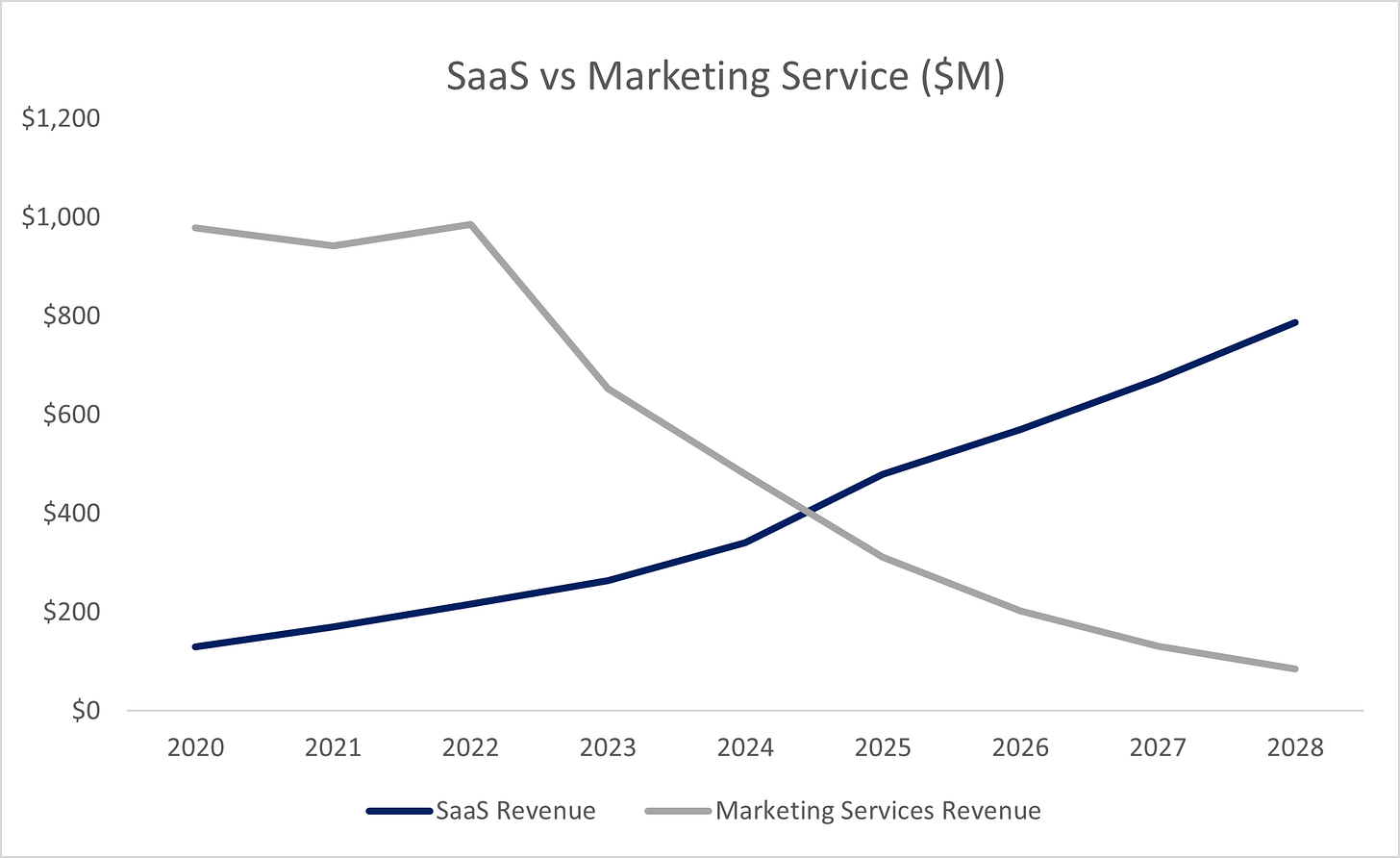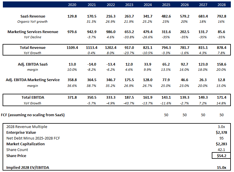Despite growing twice as fast as the average software company in the above table, its SaaS business trades at a 50% discount. This analysis also assumes no revenue/EBITDA will be generated from the marketing services business moving forward, which is not the case. Management expects to harvest $250-300m of FCF from the print business from 2025 to 2030. It’s also worth noting that the fast decline of Marketing Services is leading to more costs being proportionally allocated to the SaaS segment, dampening margins today. Regardless, management expects significant operating leverage for the SaaS segment.