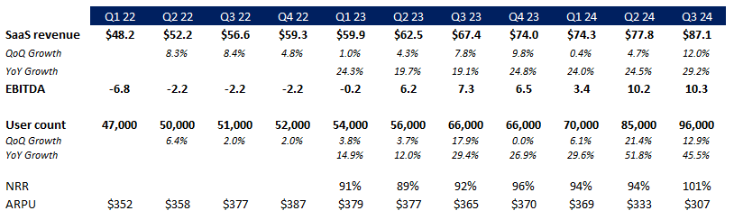 ARPU dropped from $387 in Q4 2022 to $307 as of Q3 2024. The strategy is taking advantage of the fact that upselling these customers will be significantly easier and cheaper than re-acquiring them or finding new clients. The company already sees mid-teens ARPU growth one year into this strategy as these customers upsell into different ‘centers.’ Multi-center adoption has also rapidly expanded: 2% of customers had more than one product in Q2 2023 versus 12% as of Q3 2024. Basically, management has a clear line of sight in doubling its user count and expanding its ARPU by over 50% through multi-product adoption.