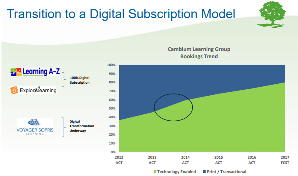 Mr. Walsh was Chairman of Cambium Learning, ticker ABCD. He joined in March of 2013, following the resignation of most of the executive team. The new board was instrumental in shaping the company’s strategic pivot. The stock price was $1.01 then, dropping from a high of >$40 a decade prior. Cambium was struggling, with EBITDA declining rapidly and the balance sheet deteriorating at 6x net debt/EBITDA. The new management team stabilized the company and made a significant push into digital and technology-enabled solutions, away from printed educational content.