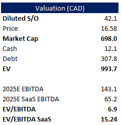 An investor day was held on December 3rd, 2024, to outline long-term targets. In 2025, they expect 18-20% SaaS growth, mid-teens EBITDA margin, and 75-78m revenue contribution from the Keap acquisition. They expect a 35% decline in revenue for marketing services as they lengthen the print cycle from 18 months to 24 months. However, they will maintain their mid-twenties margin. The company expects 20% SaaS growth and 20% EBITDA margin in the medium term. Using some of the assumptions above, I get the following valuation: