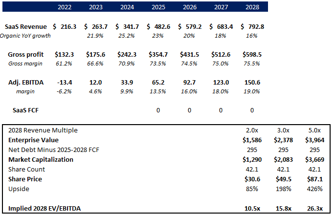 Assuming they can continue showcasing an 18-20%+ SaaS growth rate, it is not crazy to believe the stock can re-rate to 3x the next twelve months’ revenue. I have also assumed no scaling in FCF for the SaaS business, which obviously won’t be the case. At a target price of $54.20, the stock represents a 226% upside in two years.